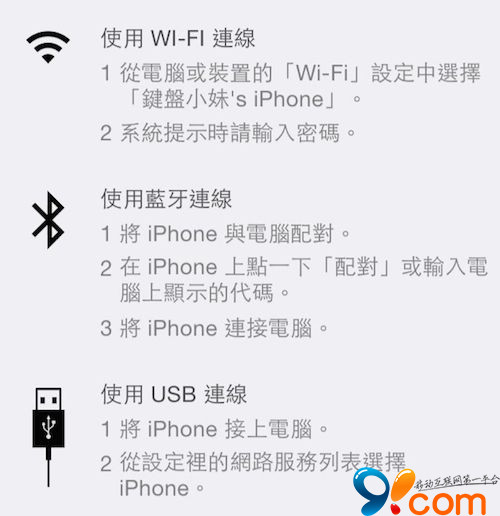在打開 iPhone 的「個人熱點」功能可以發現有三種方式分享 iPhone 的網絡,這些功能哪裡有差異呢?如果我要分享給 iPad 、Mac 又要用哪種方式呢?