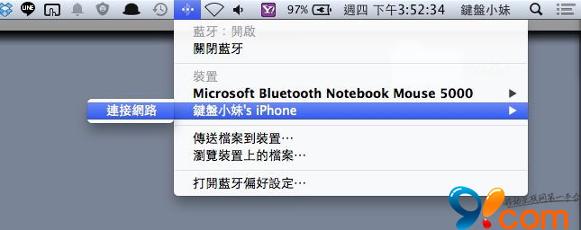 只要 iPhone 與 Mac 互相配對過,之後可以直接在藍牙選單裡進行網絡連接,當然可以插著傳輸線邊充電邊使用網絡那最好, 但是沒帶到線,用藍牙連接網絡也超方便。