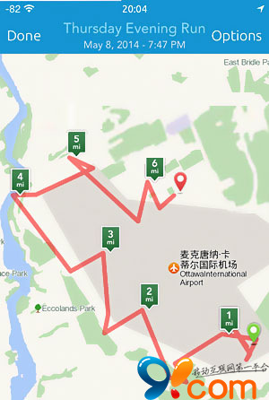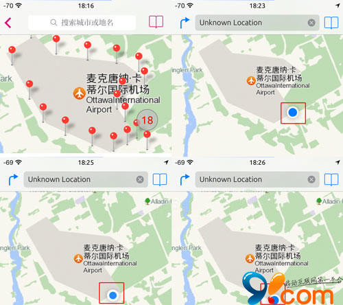 進入全局位置自定義菜單,找個適合跑步的地方。加拿大的麥克唐納.卡蒂爾國際機場不錯!圍著這個機場,每在一個位置長按一次,即確定一個坐標。標記的時候會顯示編號,標好後,點擊標記也會顯示編號。我依次標上18個坐標,保存以後,我們先進手機自帶“地圖”看一下。注意查看各圖上的時間和位置情況。位置是隨著時間變換變換的。