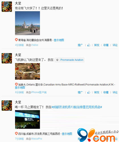 這三條微博分別來自不同的客戶端,簽到的位置是各不相同的!哈哈,是不是非常高端!這個功能太牛了!可以用N個軟件分別“跑步”!比超人還超人!