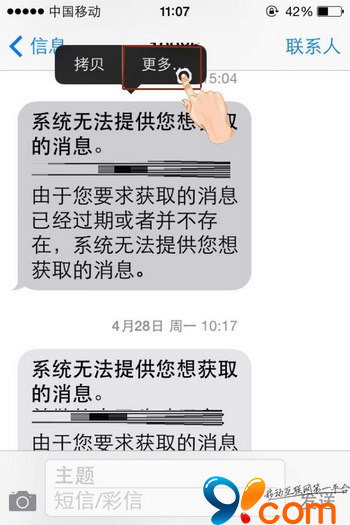 第一步,在“短信”應用頁面,進入需要刪除短信的聯系人。接著在該聯系人短信頁面,長按其中需要刪除的某條短信,即可顯示“拷貝”、“更多”選項。