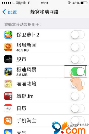 第一步,在“蜂窩移動網絡”頁面,啟用該功能後,可以在頁面下方看到可使用移動網絡的應用。
