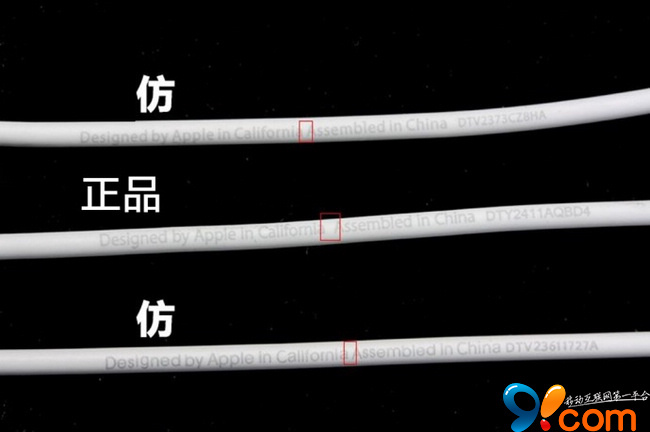 在距離插口部分約10cm處,有一行極其細小的文字(觀察時注意不要盯著太久,有損視力)。在“California”與“Assembled”這兩個單詞之間有一個空格,在China和後面的序列號“DTX…”之間,則是有兩個空格。檢查這兩處,就會發現仿品或多空或少空了。
