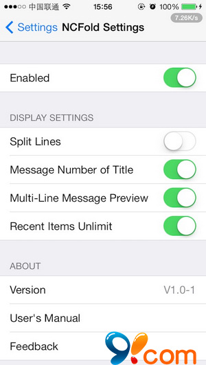 安裝完成後,依次打開【設置】→【NCFold】進行相關設定,首先點擊【Enabled】開啟開關,然後選擇是否添加分割線、在標題上顯示推送數量,啟用/禁用無限顯示等。