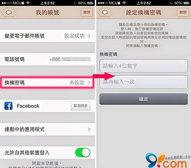 但為了讓大家更安心使用 LINE,最新的 LINE 4.3 版加入了“換機密碼”功能,再多一道身份認證步驟。如果你今年換 iPhone 6 的話,在新手機想用原本的 LINE 帳號,除了要輸入綁定的“電子郵件帳號和密碼”外,還要再多輸入一個“換機密碼”雙重認證。