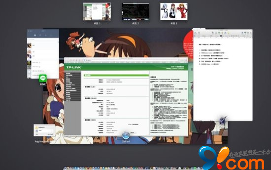 歷經數次升級,從十年前 Mac OSX 10.3 內置的「Expose」到現在的 Mission Control,這項功能一直都是 Mac 上用來管理視窗的好幫手。只要按下上圖中紅圈的按鈕(如果使用非蘋果原廠鍵盤,請按 F9),或是四支手指在觸控板上下上滑動,就可以啟動這項功能,如下圖: