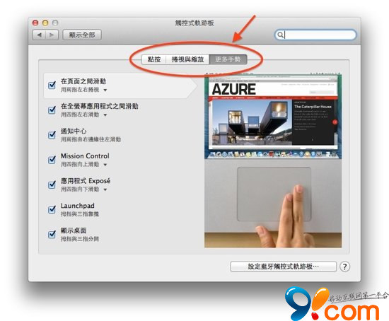 打開之後你會發現,其實這塊觸控板並不只是用來充當滑鼠那麼簡單,在上圖紅圈圈的三個分頁中,全部加起來總共有十五個不同的觸控板控制手勢可供設定,另外觸控板的移動速度也能在這裡做設定。