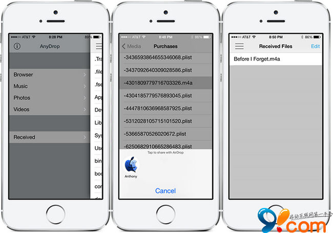 AnyDrop 2 的功能很簡單,就是將 AirDrop 功能全面開放,只要是 iPhone / iPad 內的資料文件都可以通過 AirDrop 簡單傳送。安裝之後主頁會出現 AnyDrop 2 應用程序,打開就是 iOS 系統文件管理。任何文件你只要在這裡找出來,就可以通過 AirDrop 傳送給另一部 iOS 設備,速度達 20MB/s。