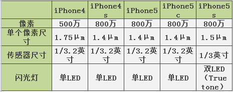話不多說,在樣張對比之前先為大家呈現一下iPhone4、iPhone4s、iPhone5、iPhone5c和iPhone5s幾款產品之間的拍照硬件參數對比——