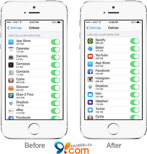 在iOS 7 蜂窩移動網絡裡有一個數據流量統計,蘋果是按照應用名稱來排列顯示,而CellularUsageOrder則豐富了它的功能,它可以讓應用按照使用數據流量的多少來順序排列。