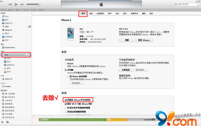 2.進入itunes,打開邊欄,依次點擊你設備的名稱→摘要→去除【連接此iPhone時自動同步】前面的√即可。