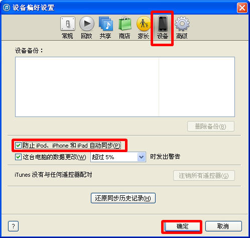 依次進入【編輯】→【偏好設置】→【設備】→去除【防止iPod、iPhone和iPad自動同步】→【確定】