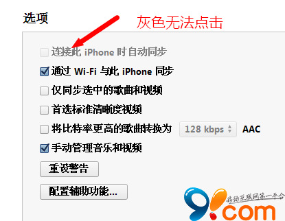 提示:如果此時你發現【連接此iPhone時自動同步】是灰暗無法進行勾選和去除勾選的操作,可按照以下步驟解決