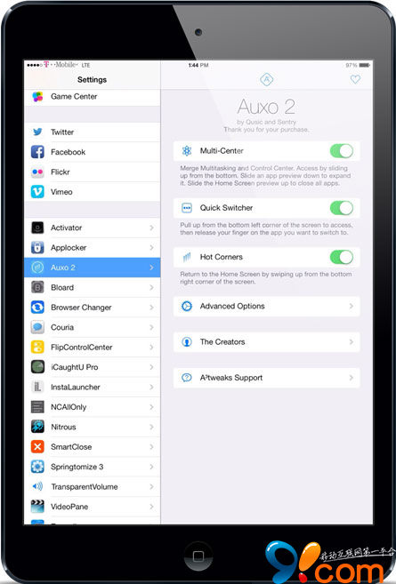 早先A3Tweaks給我們帶來了Auxo 2,目前已升級支持iPad,且並未增加或刪減任何功能,其與之前支持iPhone版基本相同,只是在設置選項上稍有變化。不過v1.1版本Auxo 2在某些方面依然存在問題,比如在進入Quick Switcher模式時,iOS 7動畫有時會出現滯後的現象。