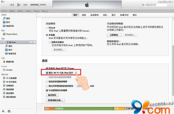 第二步,首次使用時,需要先用數據線把你的iPad和電腦連接好。需要提示大家的是,新版iTunes默認不顯示側邊欄,可以使用“Ctrl+S”打開,然後找到你的iPad,右側找到“選項”,然後勾選“通過Wi-Fi與此iPad同步”復選框。