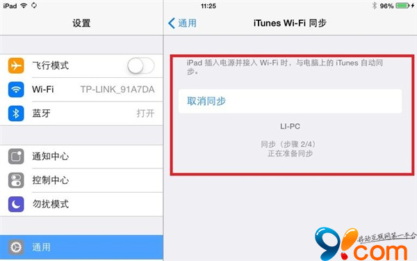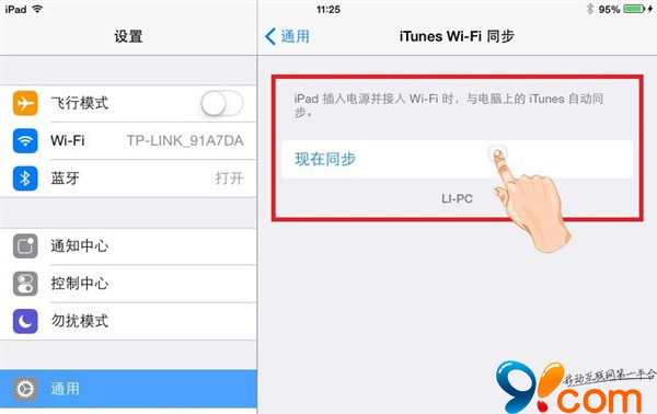 第四步,在打開的窗口中,可以看到提示:當接入Wi-Fi時,會與電腦上的iTunes自動同步。此時可以拔下數據線,點擊“現在同步”按鈕即可進行同步了。