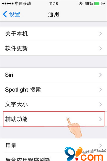 其次,在“通用”選項界面,=進入“輔助功能”界面,找到“肢體活動”分欄目中的“AssistiveTouch”功能。