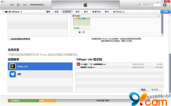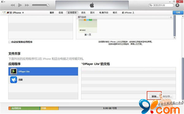 首先,打開iTunes,進入iPhone中“應用程序”頁面,在該頁面下方,點擊應用程序“OPlayer Lite”,然後在其右側點擊“添加”。