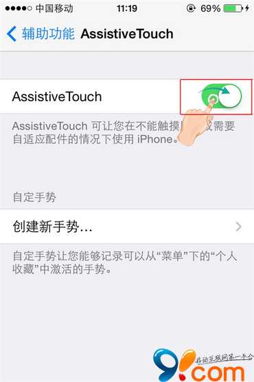 最後,在“AssistiveTouch”功能頁面,向右滑動功能開關按鈕,即可開啟該功能。這時,虛擬按鍵(即小圓點)就顯示在iPhone屏幕右下方。