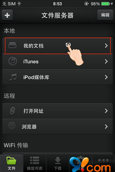 在iPhone手機,“OPlayer Lite”應用程序頁面,點擊“我的文檔”。