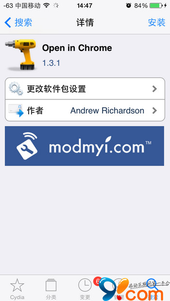 免費安裝Open in Chrome: 1. 首先你的設備必須是已越獄的 (查看越獄教程),先開啟 Cydia,在底部選【搜索】,然後在搜索框中輸入Open in Chrome。 提示:如果搜索不到Open in Chrome,可以進入Cydia—【變更】—點擊左上角【刷新】—再搜索該插件。 2. 進入後按右上角的【安裝】,然後點擊【確認】,便會自動開始安裝。