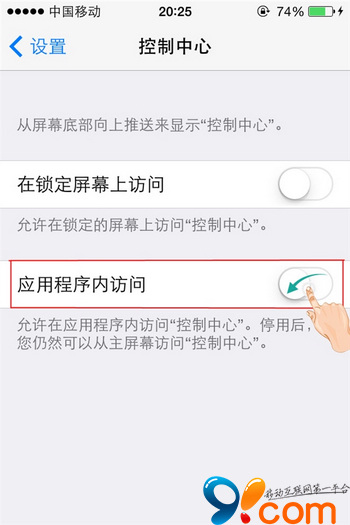 為防止這種情況出現,用戶可以設置禁止在應用程序內訪問iOS7控制中心,操作時在“設置”頁面進入“控制中心”選項,關閉“應用程序內訪問”開關即可。