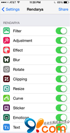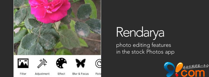 Rendarya是一款功能非常強大的插件,它支持擴展ios7原生照片編輯功能,在原有的去紅眼、一鍵增強、添加濾鏡、旋轉,裁剪等基本功能外,還添加了色調、虛化、鈍化調整,貼紙、表情符號,文本的添加等。
