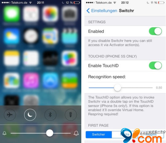 Switchr for iPhone 安裝後,進入【設置】→【Switchr for iPhone】→開啟插件開關【Enabled】,然後根據需求來設置相關選項。另外該插件需配合activator手勢設置使用。往左滑依次是後台,音樂播放器,快捷開關聲音。經用戶反饋快捷開關無法設置。