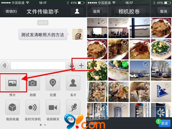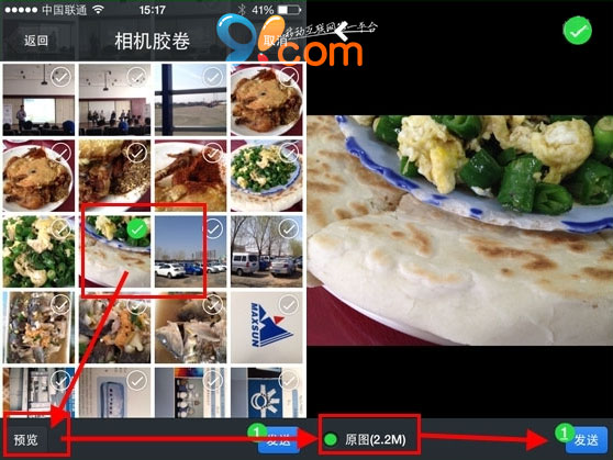 2、選中要發送的照片後,點擊左下角的“預覽”(這個是重點)。在預覽照片的左下角看到一個“原圖”單選,點中後發送,就可以將未壓縮的原照片進行發送了。