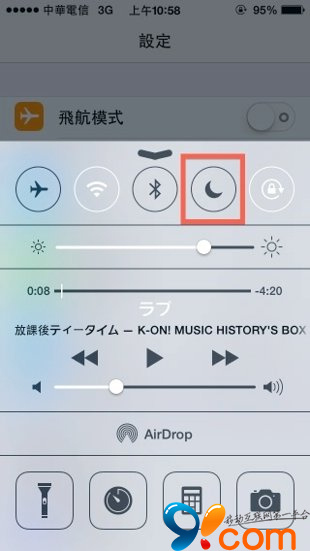 只要從屏幕最下方(HOME 鍵的位置)往上滑動,就可以叫出上圖這個 iOS7 的新功能面板「控制中心」。畫面中有個「月亮圖案」,只要點擊他,所有的電話、信件、信息就通通無法傳進來啰!這樣就不用擔心會被吵醒啦~
