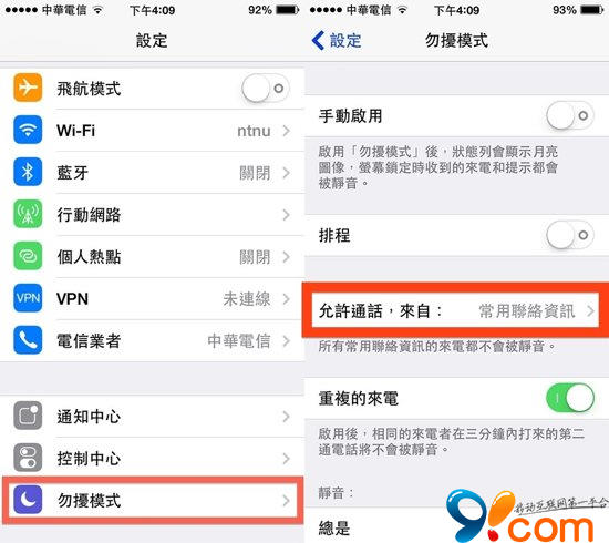 但是如果有些人,例如媽媽、老婆、女朋友等是一定不能漏接電話的該怎麼辦呢?只要到 iPhone 的設定裡,到「勿擾模式」中把「不能漏接電話的對象」新增到「允許通話,來自」的名單裡面,就不用擔心在勿擾模式中漏接特定對象的電話啰!