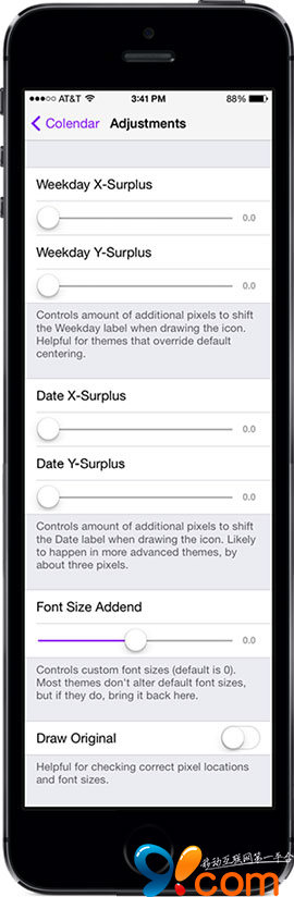 Colendar是一款針對日歷圖標顯示內容(星期、日期)顏色自定義插件,你可對日歷圖標上下,星期與日期分別進行顏色設置,內置28種顏色方案供您選擇。除此之外,Colendar還提供字體大小設置與字體偏移設置,你可根據您的喜好進行定制以適配Winterboard主題圖標。目前該插件已在Cydia上架,售價0.99美元。已越獄的設備可開啟Cydia,在底部選【搜索】,然後在搜索框中輸入Colendar購買安裝。