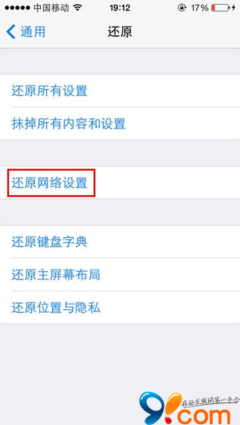 3、點擊【設置】>【通用】>【還原】>【還原網絡設置】,重新還原網絡設置。這將會重置所有的網絡設置,包括藍牙配對記錄、Wi-Fi 密碼、VPN 和 APN 設置。