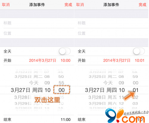 曾經有用戶抱怨在iPhone的日歷中添加事件時,分鐘數的時間間隔是5分鐘,無法設置成10:01這類短分鐘時間。其實這個問題只需輕輕雙擊便可解決。目前iOS7默認是1分鐘間隔。如果您需要在“1分鐘間隔”和“5分鐘間隔”之間切換。只需要在日歷添加事件的編輯頁面,在“分鐘”的滾動條上雙擊兩下即可切換。