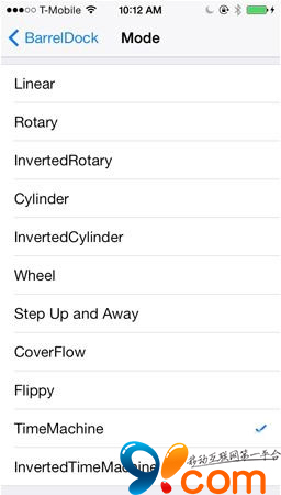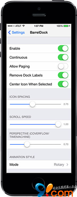 DockFlow 安裝完畢後,用戶可以進入【設置】→【DockFlow 】中設定選項,可選擇包括旋轉、滾動、時間軸、圓柱滾動等 10 種動畫效果,在默認 Dock 欄有 4 個圖標的情況下,根據不同效果就能看到不同的圖標變化。