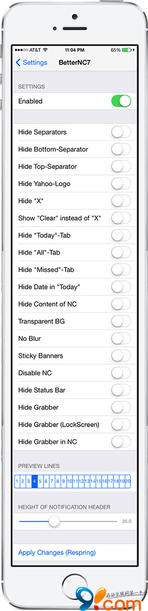 可以對通知中心頂部、雅虎標志、清除“X”圖標等進行隱藏,同時你還可以開啟透明通知中心,並且對通知中心各項目的高度以及間距等進行設置。