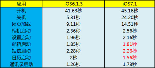 通過以上的實際測速表格,我們可以較清晰的看到這其中的區別。多數情況下依舊是iOS6.1.3的流暢度要高於蘋果iOS7.1,但也有一些應用的開啟速度上蘋果iOS7.1要快於蘋果iOS6.1.3,圖中用紅色字體標出。由於iOS7.0.x版本本身操作體驗極差,這裡就不推薦大家嘗試體驗了,如果想要體驗最新的系統,建議iOS6.1.3用戶或者在iOS7.0.x系統中掙扎的朋友們直接刷入iOS7.1固件更為穩妥。