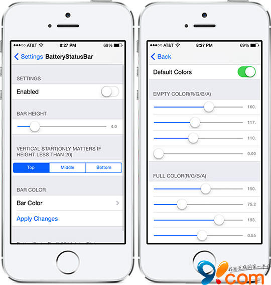 BatteryStatusBar可以在iPhone狀態欄上方增加一條當前剩余電量進度條。以進度條形式向您展示當前電量,隨著電量減少,進度條顏色也會隨之變化,電量大於65%會顯示綠色,小於65%但大於30%會顯示橙色,小於30%會顯示紅色。