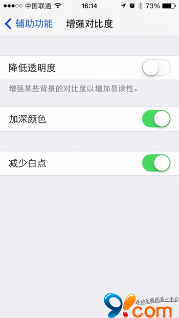 依次進入【設置】→【通用】→【輔助功能】→【增強對比度】,然後如下圖所示,將【降低透明度】關閉就可以恢復之前的半透明背景了。