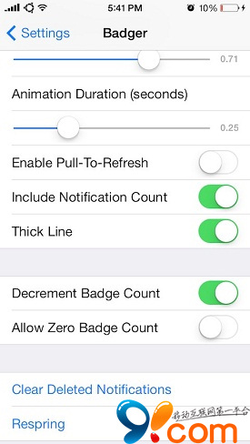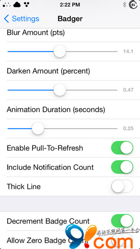 安裝完成後進入【設置】→【Badger 7】進行相關選項設定,你可設置模糊度、漸變度,動畫持續效果時間以及功能的開關控制。