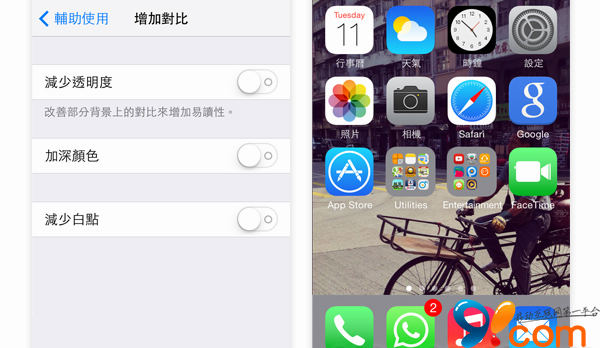 「輔助使用」裡面的「增加對比」一項變成三個選項。首先「減少透明度」就是令 iOS 7 界面各種的半透明底色去除 (例如主頁 dock / 通知中心 / 控制中心),變成實色。「加深顏色」顧名思義就是令顏色深一點,更易看明顯。「減少白點」就是令界面的白色部分變成淺灰色。
