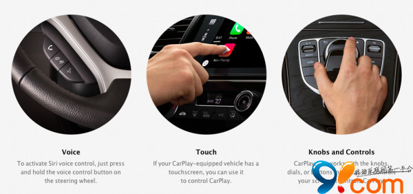 在CarPlay 介紹頁面裡出現了三種操控方式:語音 (Siri)、觸控、旋鈕等實體按鍵控制。語音控制就不多啰嗦了,Siri 在iPhone 上有多大能耐,估計在CarPlay模式下也差不多。有一點特別值得贊賞,蘋果和車廠合作,在方向盤上加入了Siri 啟用按鈕,長按說話即可。看到有微博評論說,“Google Now已經不需要按鈕激活語音控制了,Siri 還需要按個按鈕,實在是需要改進。” 就不在這裡吐槽了,請想象,車上載了一個過於活潑的熊孩子會是什麼情況。