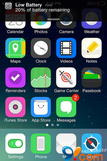 當電量低於20%或是10%的時候,iOS 系統就會在屏幕正中央顯示電量低的警告信息,這時候無論你正在玩游戲還是進行輸入文字的操作,都會被打斷。然而安裝了PowerBanners插件後,20%和10%的低電量警告都會在橫幅通知上作為通知出現,而不是警告,這就不會打斷你正在進行的操作,即使電量處於低的水平。