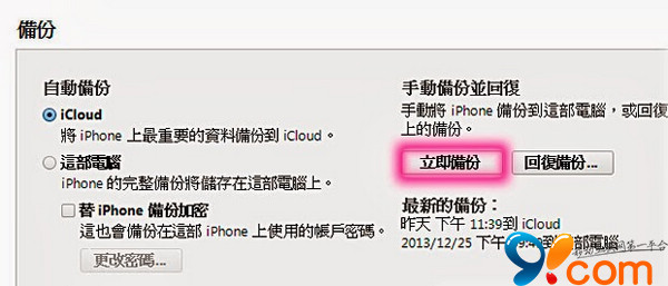 備份 (Backup):將 iPhone 裡的資料備份到電腦 iTunes 上。