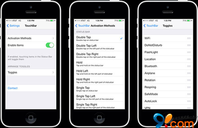 TouchBar 支持包含 iPhone 5s 在內的所有蘋果設備,運行環境為 iOS 7.0 及以上。需要注意的是,這款插件需要與 Activator 配合使用,安裝之後你可以在“設置”頁面中對操作進行定義並激活手勢。之後你可以雙擊頂部狀態欄喚出一個獨創的功能開關欄,而這裡的每個開關按鈕都可以按照自己的意願來進行排序。另外插件還允許用戶對狀態欄的各種功能進行單擊關閉,你也可以另外進行相關操作設置,不過由於狀態欄的觸摸區域太小,所以像這樣的關閉方式用起來還是稍顯困難,如果你不介意這個小瑕疵的話現在就可以去下載嘗試了。
