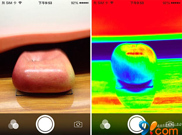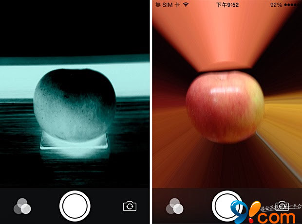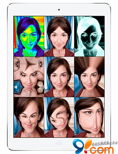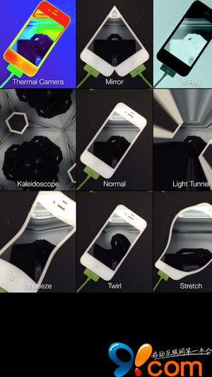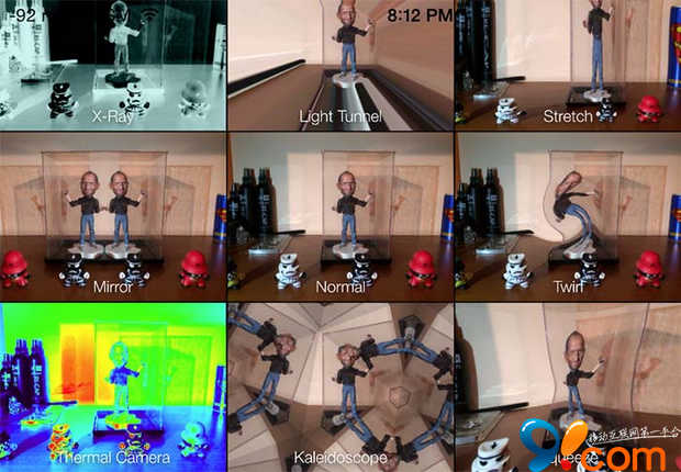 和 iPad 版 Photo Booth 一樣有 8 種濾鏡:Thermal Camera (熱感應攝影機)、Mirror (鏡像)、X-Ray (X光)、Kaleidoscope (萬花筒)、Light Tunnel (光隧道)、Squeeze (擠壓)、Twirl (旋轉)、Stretch (拉伸)。