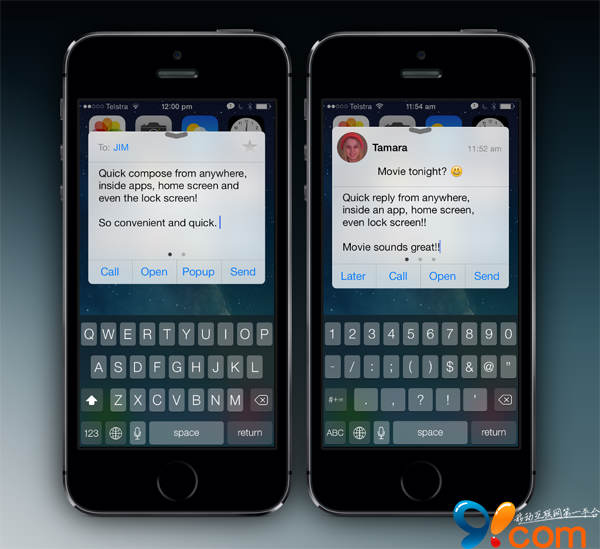 BiteSMS提供了原生應用所沒有的快捷回復和編輯新短信的功能,這兩個也是眾多果粉安裝BiteSMS的原因,那麼如何使用呢?用戶安裝後可以激活快速編輯新短信的手勢是,按一下音量鍵,然後點擊屏幕出現的音量指示器,就可以打開快速編寫的界面了。快速回復更方便,收到短信後,輕掃短信即可快速回復,甚至用不著運行原生短信程序。