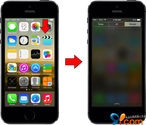 NCObey可以讓用戶直接打開想要的通知中心,使用插件後,通知中心的打開位置就會分開為三個感應區,今天(左上角)、全部(中間)及未讀(右上角),只要用戶希望打開「未讀通知」,只要用手指在屏幕右上角往下拉就可以了。