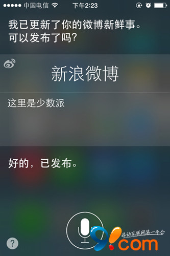 我們可以直接說出微博內容,Siri會自動識別,然後會詢問你是否發布,回應“發布”即可。同時,我們可以像往常一樣,直接在發布框中輸入文字發送。