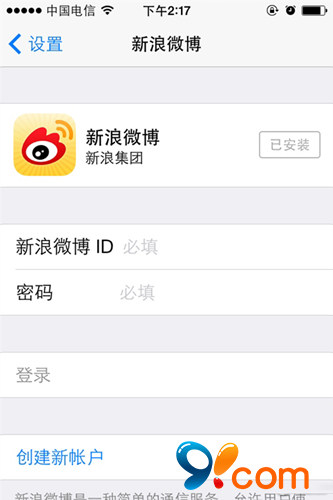 首先,我們需要在iOS7中綁定我們的新浪微博賬號。操作方式也很簡單,進入系統設置--新浪微博,輸入賬號密碼即可。
